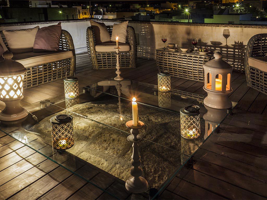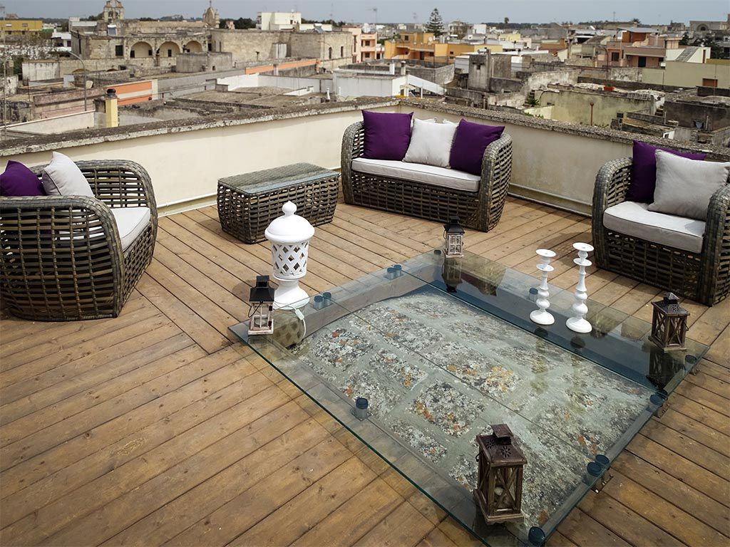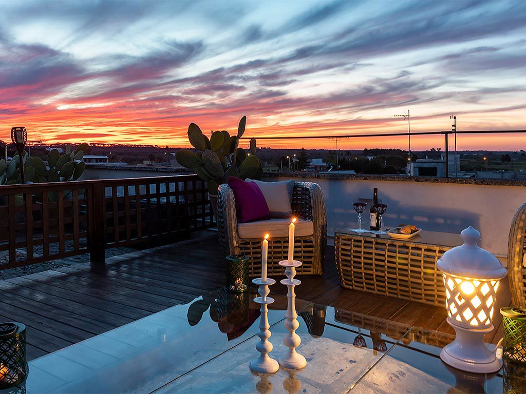 L'atmosfera che regala questa camera è magica: il camino all'ingresso, il letto a soppalco raggiungibile da un'antica scala a chiocciola in pietra e il fantastico secondo piano, con area esclusiva, per salire sul tetto del palazzo e godersi gli ineguagliabili colori del tramonto salentino.