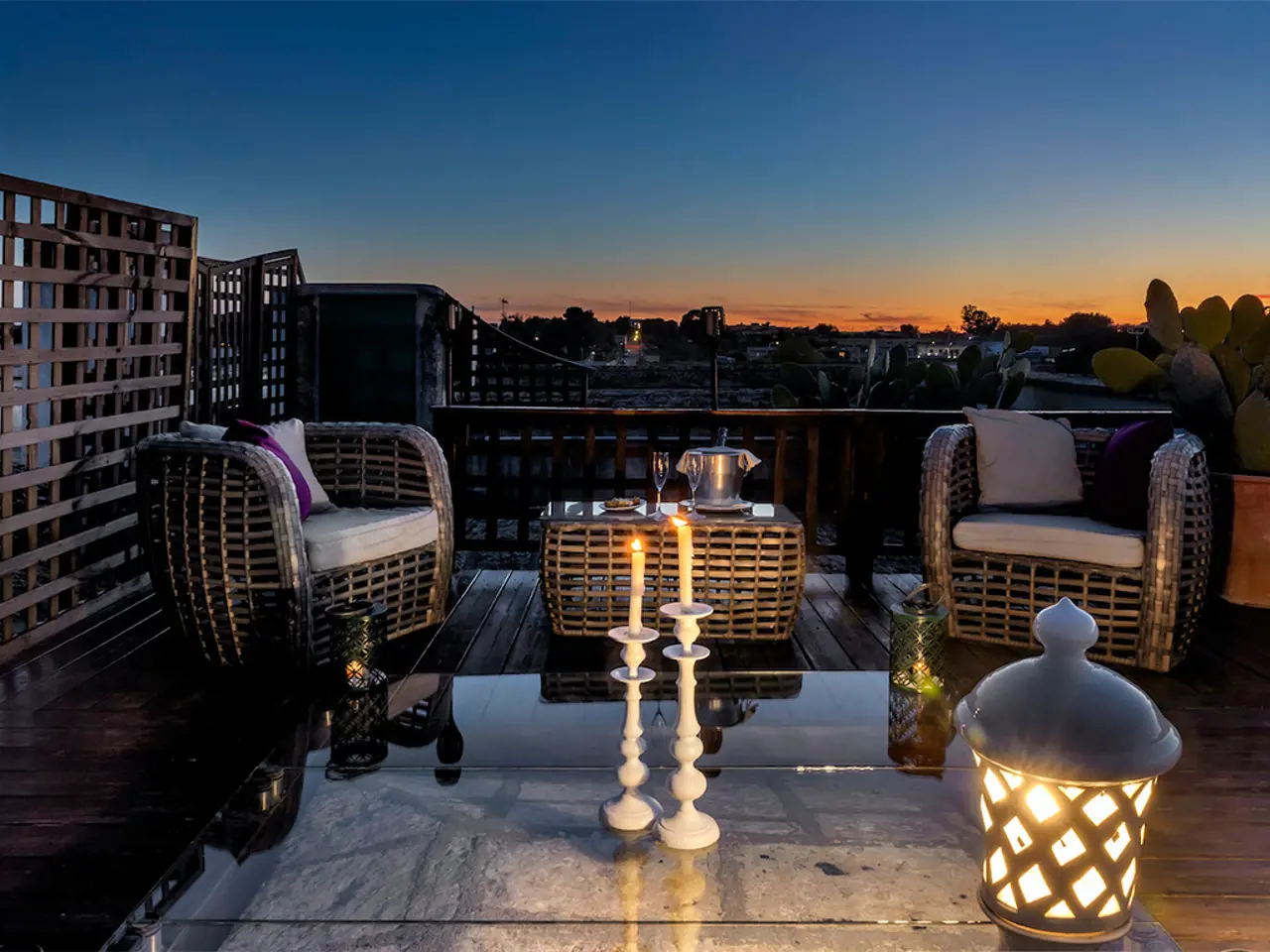 L'atmosfera che regala questa camera è magica: il camino all'ingresso della zona notte, il salottino soppalcato raggiungibile da un'antica scala a chiocciola in pietra e l'elegante terrazza ad uso esclusivo per godere in completa intimità degli ineguagliabili colori del tramonto salentino.